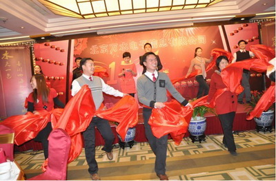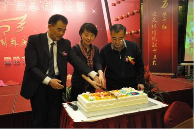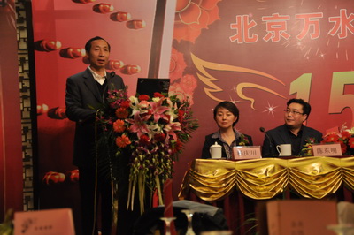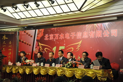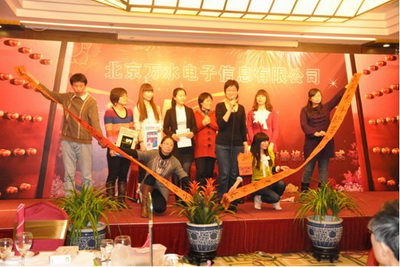 一副對聯(lián)“萬紫千紅 再接再厲 進(jìn)取豪情日日長;水遠(yuǎn)山長 精益求精 繼往開來步步高”拉開了萬水公司15周年慶典的序幕。北京萬水電子信息有限公司“15周年慶典暨2011迎新春聯(lián)歡會”于2011年1月12日在北京西苑飯店·鴻運(yùn)廳舉行。參與會議的領(lǐng)導(dǎo)有:美國萬國集團(tuán)董事長孫立哲,中國水利水電出版社社長湯鑫華、副社長胡昌支、陳東明、周金輝,原總編輯、萬水第一任董事金炎老師。與會的嘉賓有:計算機(jī)屆泰斗級專家譚浩強(qiáng)教授、國家級教學(xué)名師北京交通大學(xué)王移芝教授、北華航天工業(yè)學(xué)院副院長季福坤教授、計算機(jī)系主任安志遠(yuǎn)教授、電子系主任陳剛教授,以及長期以來關(guān)注和支持萬水工作的作者方、印廠、裝訂廠等客戶,萬水公司的老員工也都應(yīng)邀再次回到了曾經(jīng)工作過的這個地方。各方嘉賓和朋友與萬水全體員工歡聚一堂,共同慶祝萬水公司一路走來的15年。