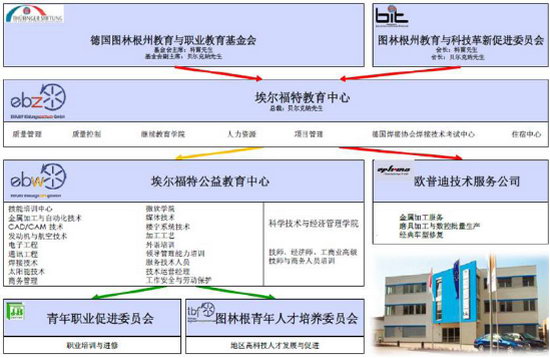 圖林根教育與職業(yè)教育基金會于2002年在德國中部城市——圖林根州首府埃爾福特市注冊成立,圖林根教育與職業(yè)教育基金會是德國最大的實體基金會之一。 基金會發(fā)起人、管理層與顧問團均是由聯(lián)邦州政府官員、聯(lián)邦州內各高等院校教授、各行業(yè)協(xié)會負責人構成。他們負責將所有資源整合積極開展國家發(fā)展戰(zhàn)略研究、科學技術研究、職業(yè)技能培訓。 基金會下轄兩個職業(yè)教育中心、兩個青年人才發(fā)展促進委員會和一個人力資源服務公司,為聯(lián)邦州內的各大企業(yè)與知名院校服務。因此,它既被工商業(yè)聯(lián)合會稱為“企業(yè)聯(lián)盟”,又被各知名院校稱為“教師與學生的技能實訓基地”。